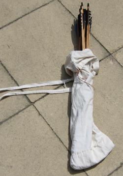 A. In the UK, the quiver -- in the sense of a leather arrow tube -- is a relatively recent innovation. It was uncommon before the Victorian era. During this era, when the bow was used for sport and hunting, leather hip quivers were quite common. In the medieval era, military archers typically carried their arrows in a canvas bag, which they tied around the waist or back. The bag could usually be tied at the top to protect the fletchings. During the battle, it seems that it was common to stick your arrows in the ground by your feet, rather than keep them in a bag/quiver. This had the dual effect of making the arrows easily accessible, and of making the points muddy. While a glancing blow with a muddy arrow point might not eliminate an enemy from the field of battle straight away, in the days before antibiotics it would likely have kept him out of the next battle.