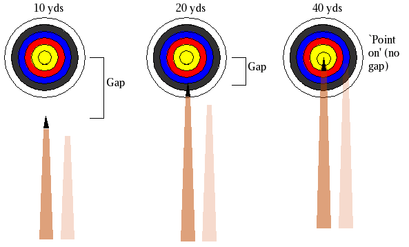 A. Gap shooting is another primitive sighting technique, and is probably used by most traditional archers even if they don't realize it. It works by the archer learning, over many shots, how far the arrow point appears to be below the aiming mark. For example, I know from repeated practice that at 20 yards I have to line up the arrow point with an imaginary point about 8 inches below the aiming mark. At ten yards the `gap' is about two feet. At sixty yards, the arrow point appears about three feet above the mark.