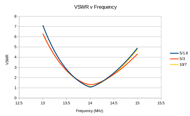 This is important because an antenna that has its centre only 5m above ground is easy to transport and assemble and, perhaps more importantly, easy to tune. 10m is really beyond the limit of practical assembly and adjustment for a portable antenna, at least in the locations I can operate from.