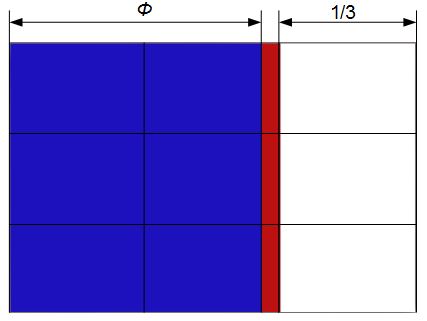The diagram below shows a rectangle divided both according to the ROT and to the GR (shown as φ in the diagram). The vertical red stripe shows the area of difference between the two approaches.